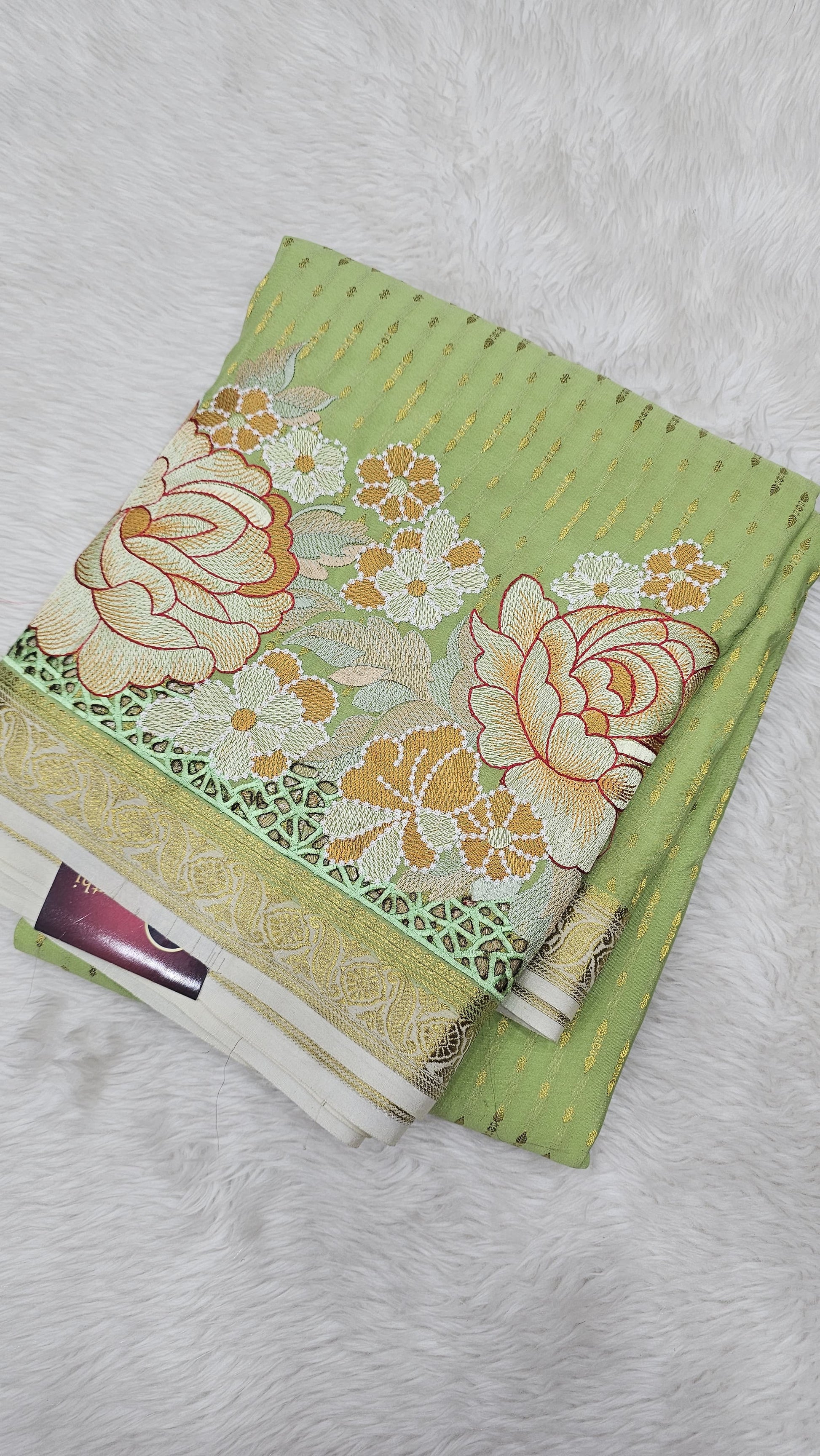 Mysore crepe silk saree in KSIC Finish in pista green with crem 1side cutwork saree