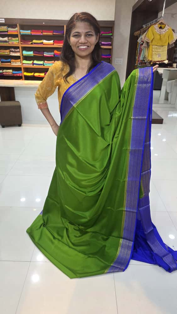 Mysore crepe silk saree with KSIC Finish in leaf green with royal blue big border