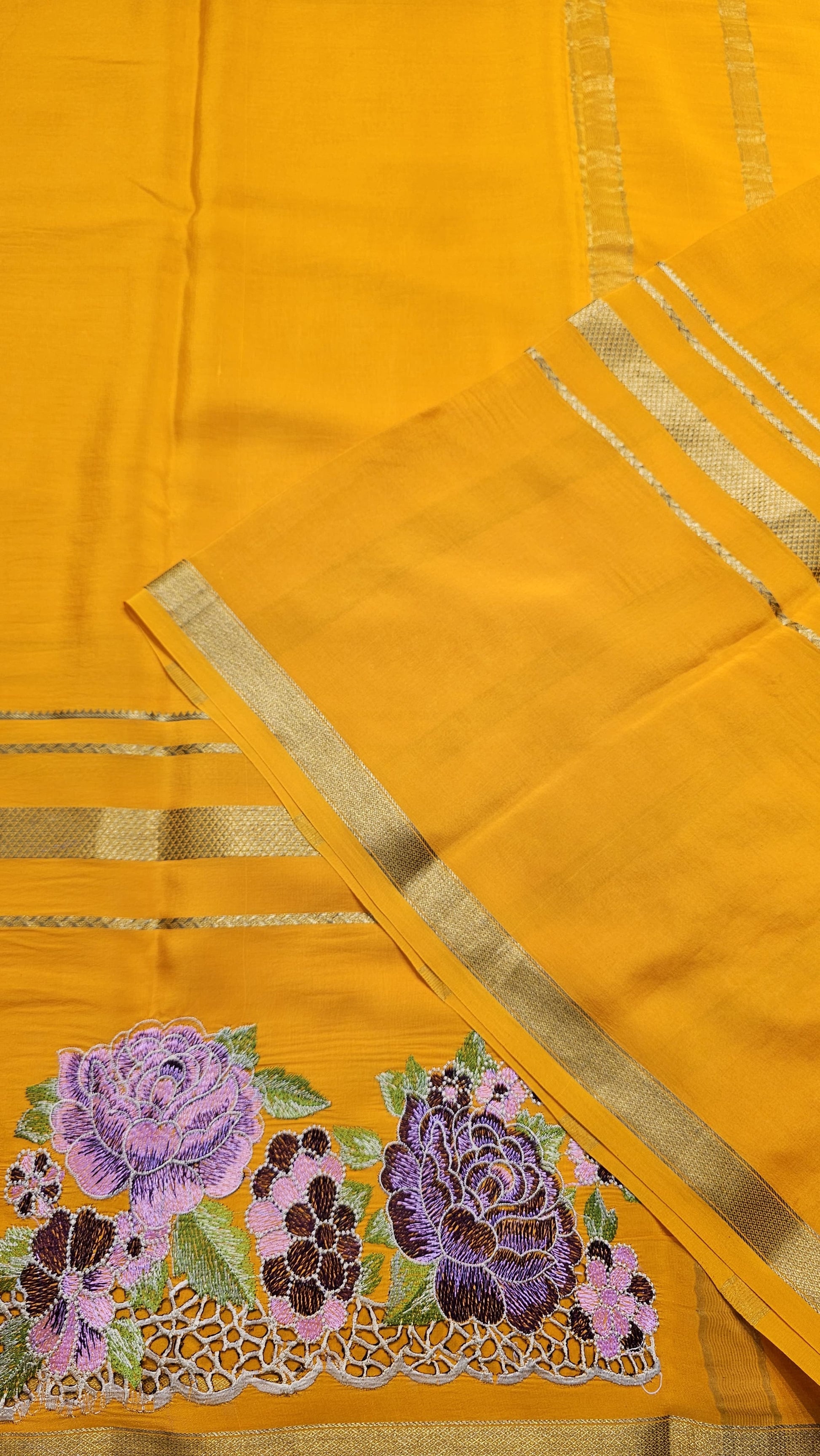 Mysore crepe silk saree with KSIC Finish in orange self in one side cutwork pattern