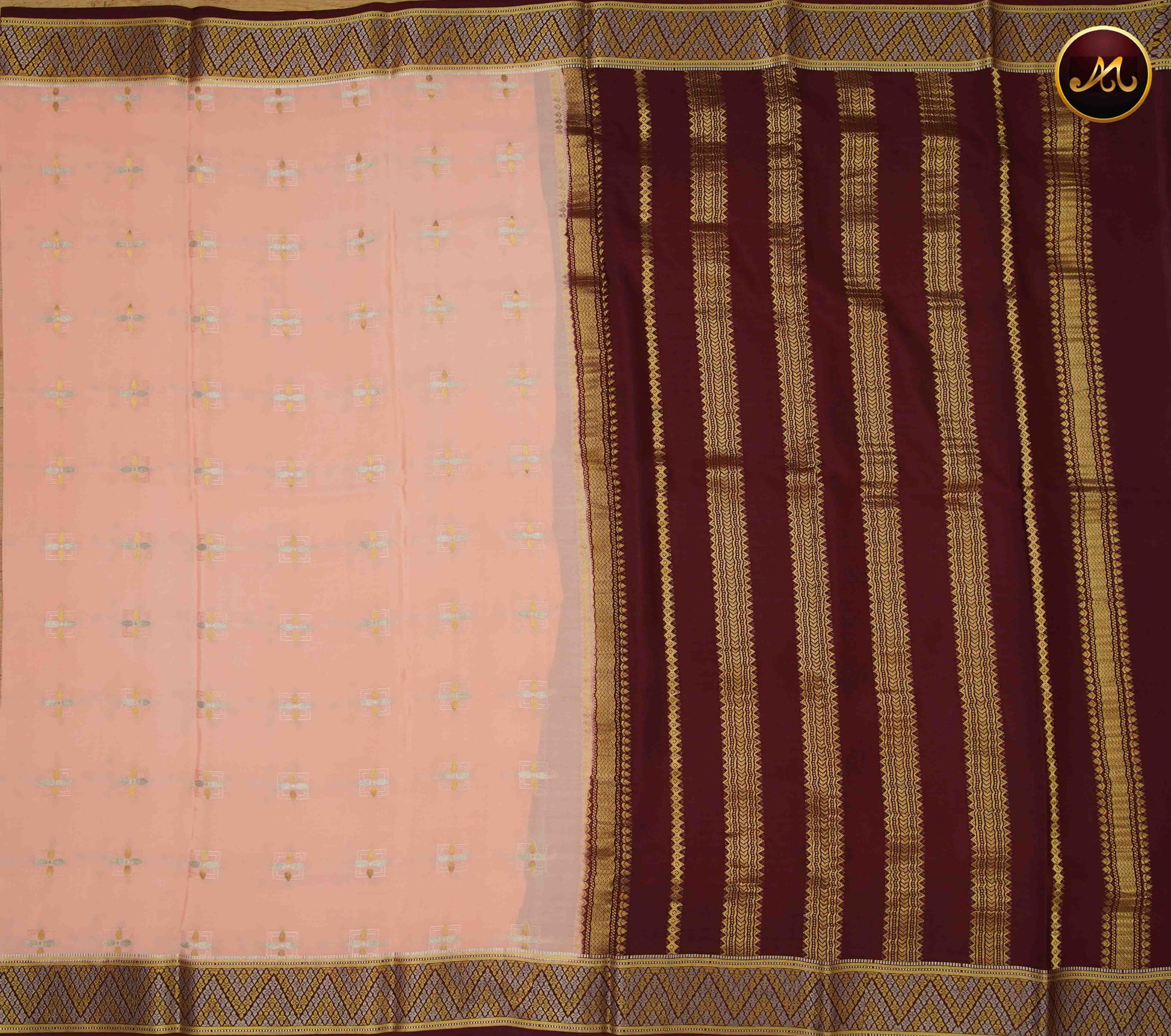 Mysore crepe silk saree with KSIC Finish in Peach and Dark Maroon combination and silver and gold zari butta and chit pallu