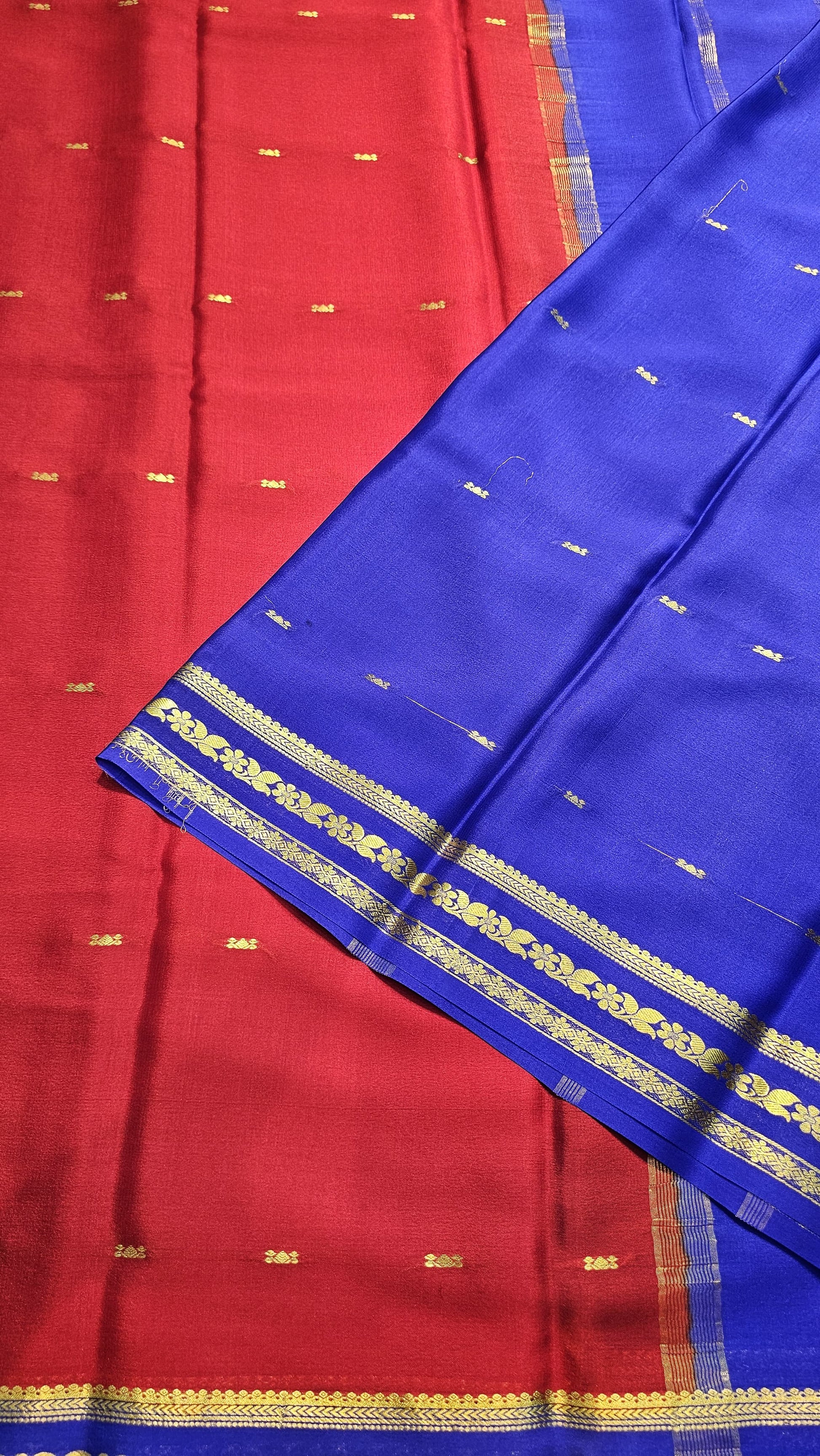 Mysore crepe silk saree with KSIC Finish in red with blue in small zari motifs pattern