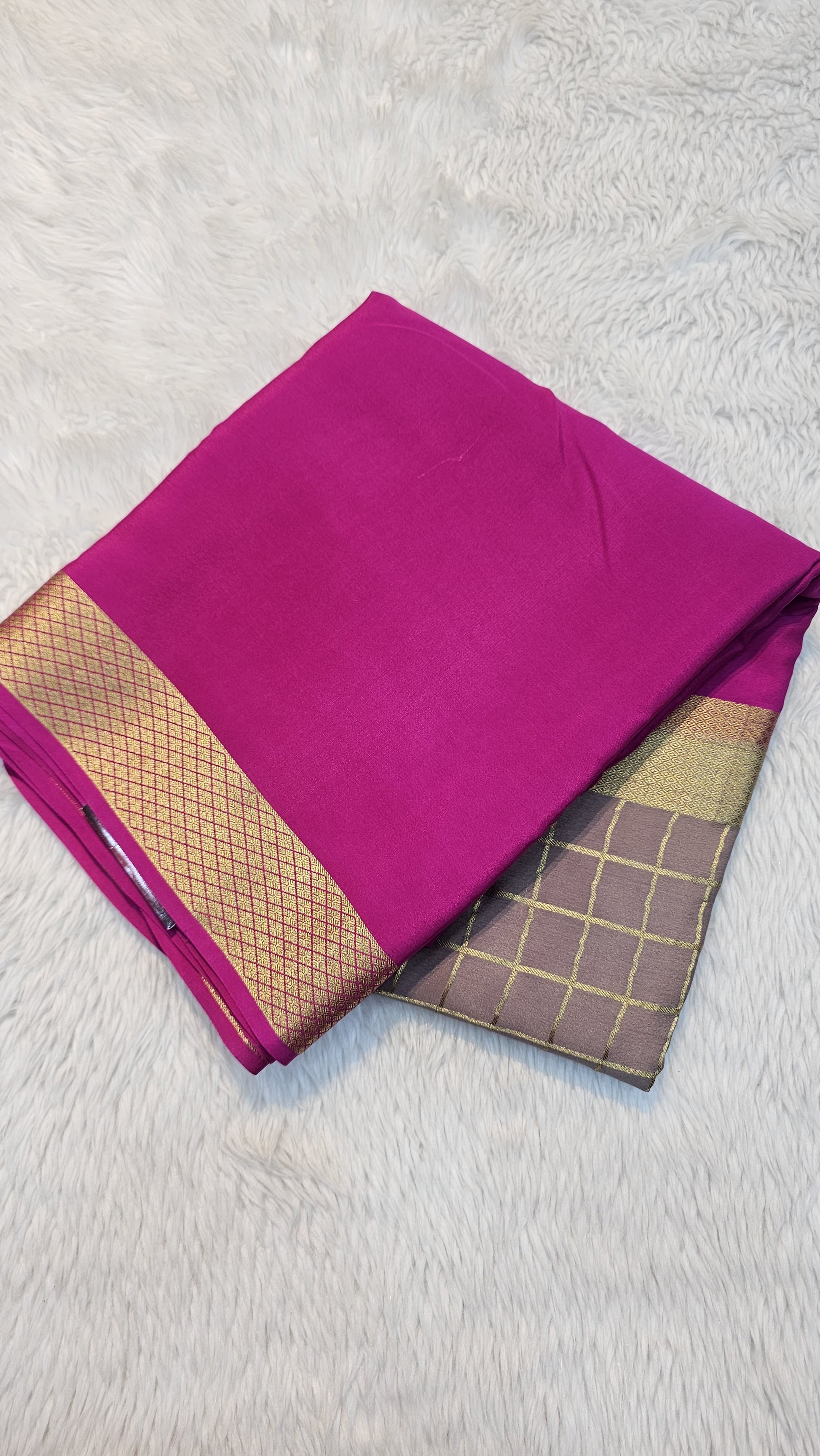 Mysore crepe silk sarees in KSIC Finish in chiku with rani pink middle checks pattern