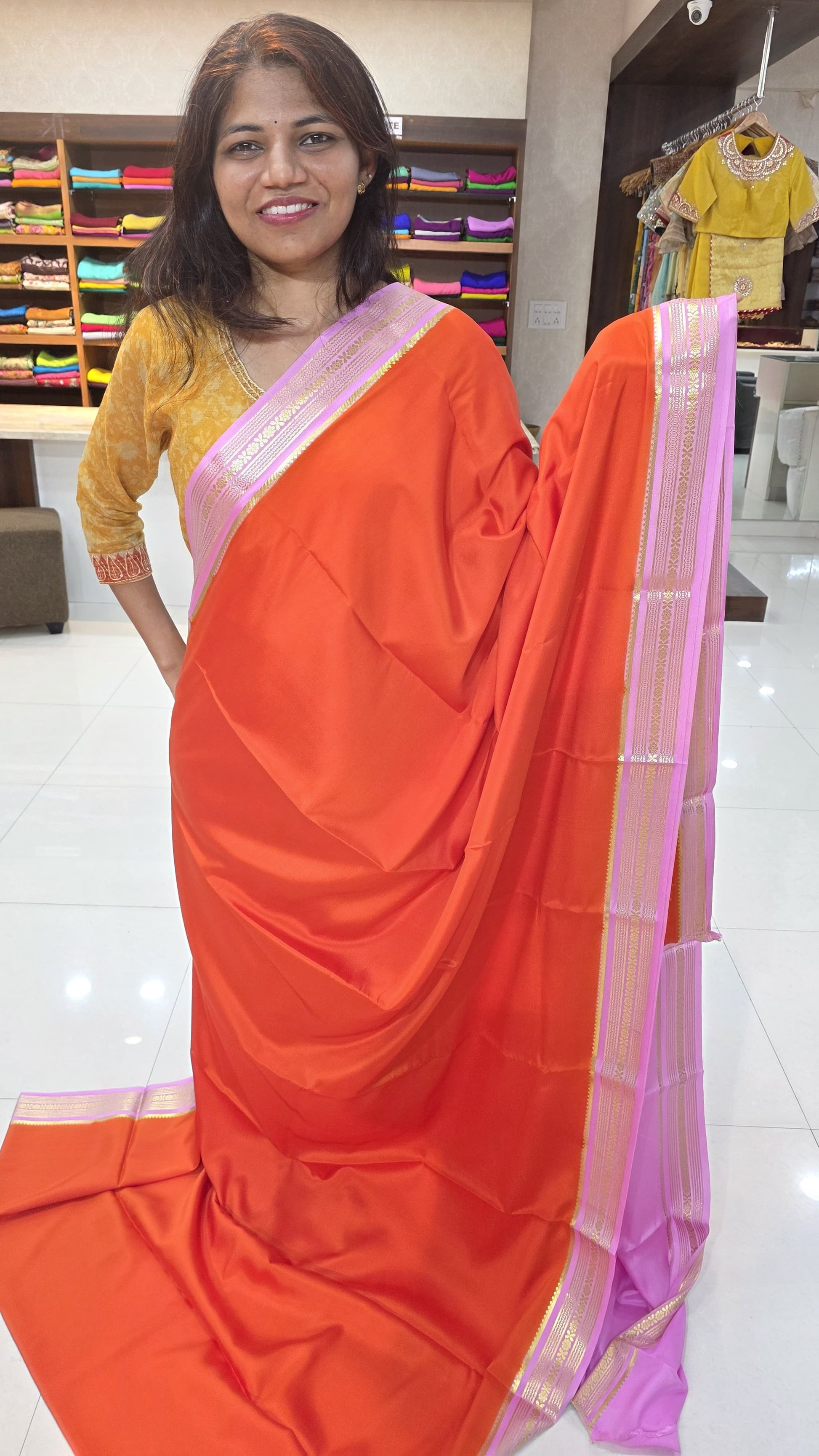 mysore crepe silk sarees in KSIC Finish in orange with baby pink flower border