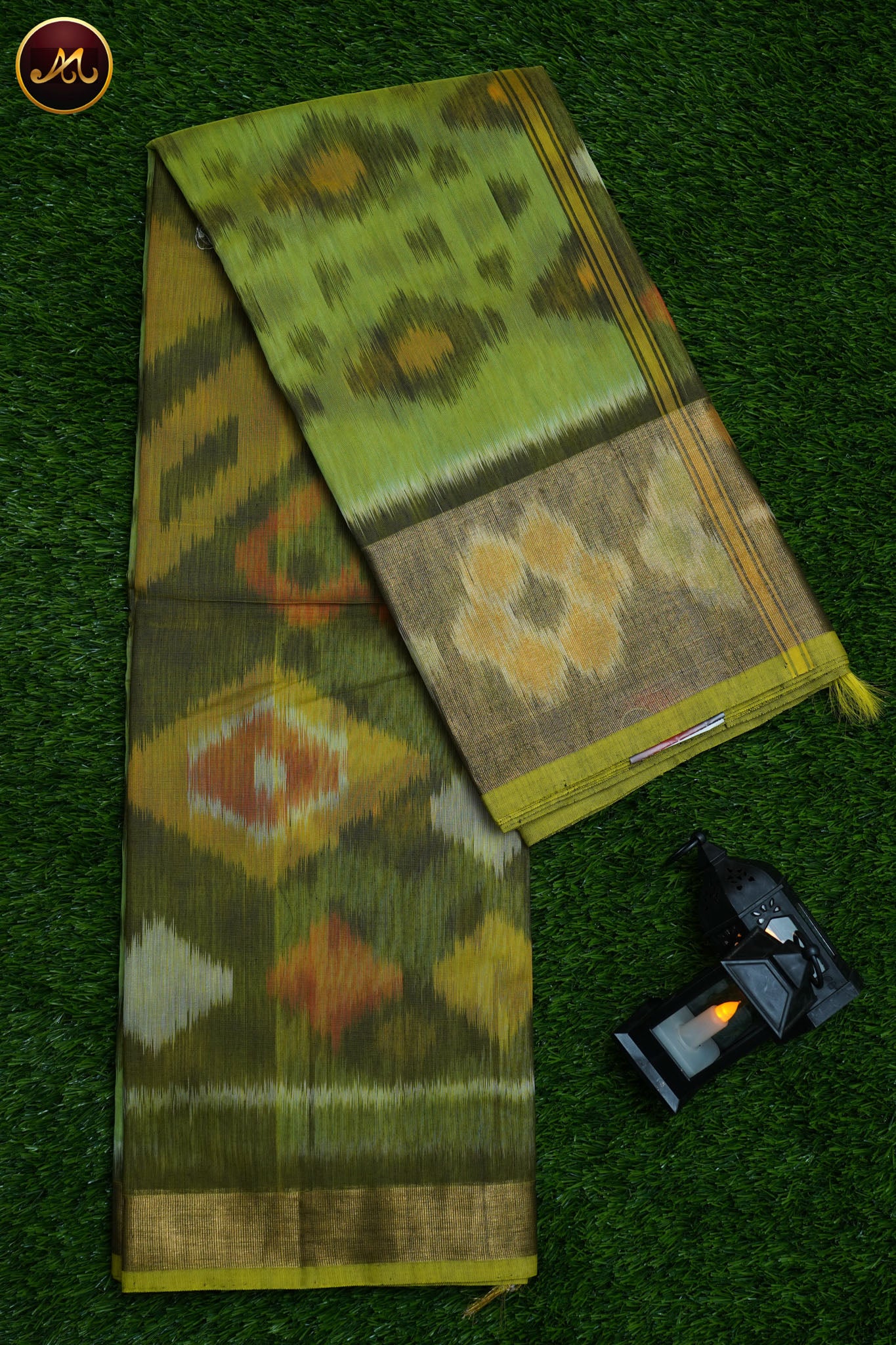Pochampally Ikat Cotton Silk in Parrot Green and Mahendi Green Combination with Temple Border